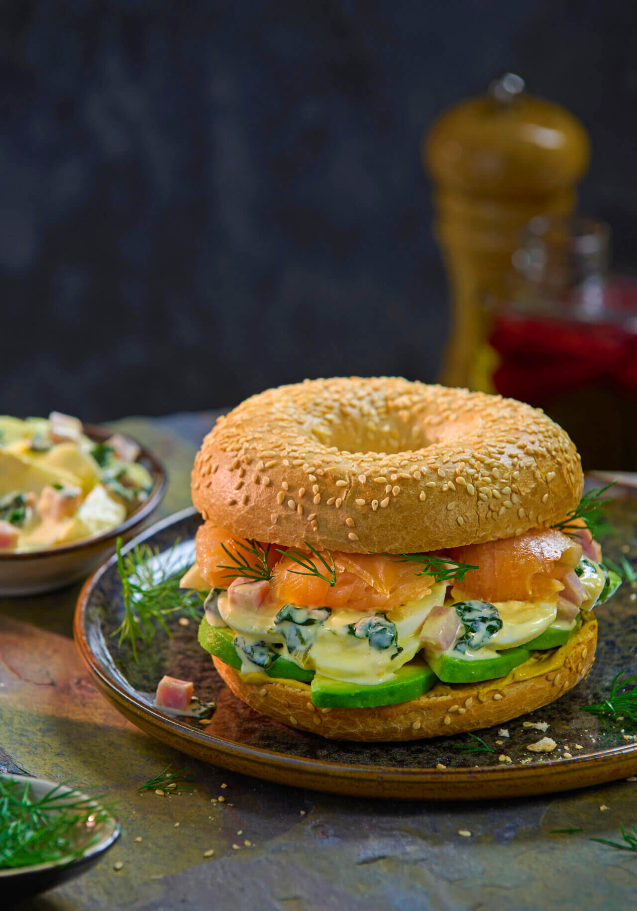 marinieren und auf der Unterseite des Bagels verteilen. Eiersalat Benedict auf den Avocadoscheiben verteilen und darüber die Lachsscheiben legen. Dill über den Bagel verteilen und Oberseite